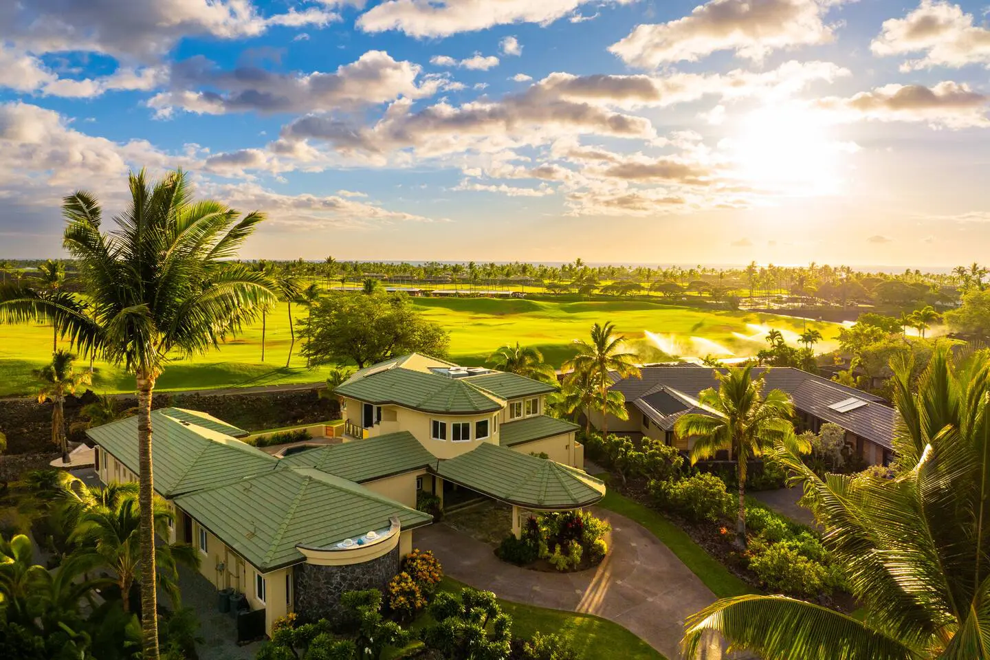 Discover the ultimate Hawaiian escape at Hale Mele 2, an elegant 5,100-square-foot, two-story luxury residence nestled within the prestigious Champion Ridge gated community on the Big Island’s South Kohala Gold Coast. With sweeping 270-degree views of lush golf courses and the majestic Mauna Kea volcano, this exceptional home blends refined sophistication with serene tropical ambiance — ideal for families or groups seeking an extraordinary island getaway.